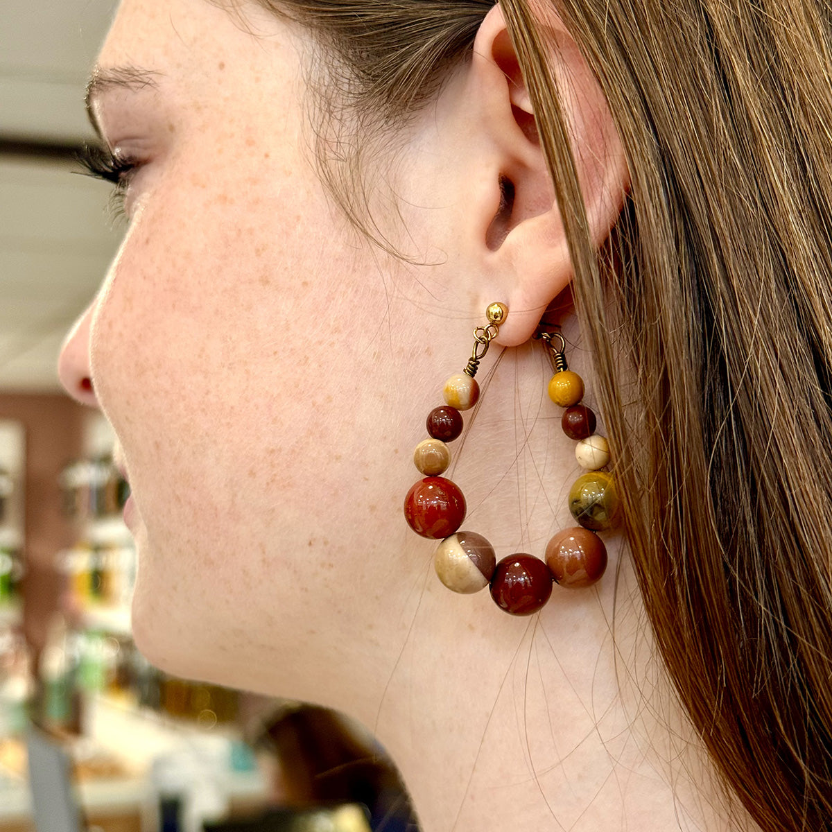 Laissez-vous séduire par l'éclat chaleureux de la Jaspe Mookaïte, une pierre aux teintes profondes d'ocre, de bordeaux, de jaune moutarde et de crème. Ces boucles d'oreilles en forme de goutte incarnent l'esprit de l'automne et le charme des couleurs naturelles.