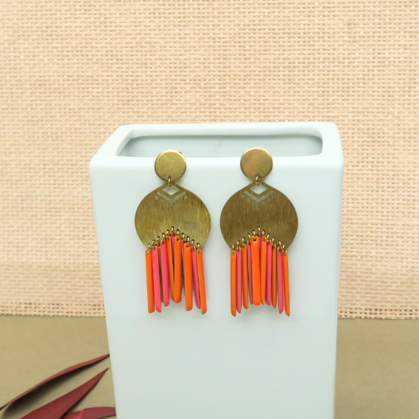 Des boucles d'oreilles fanfreluches qui dansent à vos oreilles, un modèle pétillant avec ces flamboyants sequins oranges et ce rose audacieux.