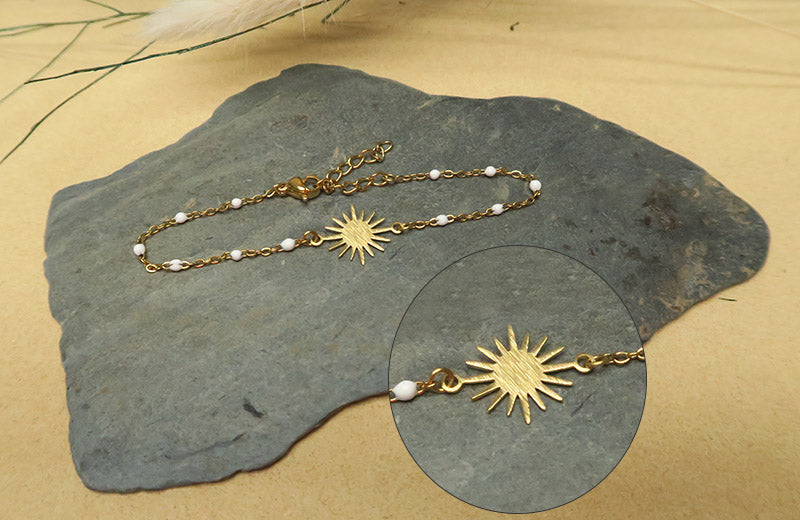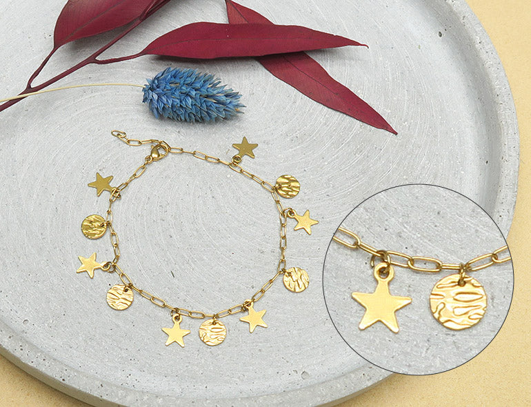Pour ce bracelet, on a accroché une breloque tous les 3 maillons avec un anneau de jonction.