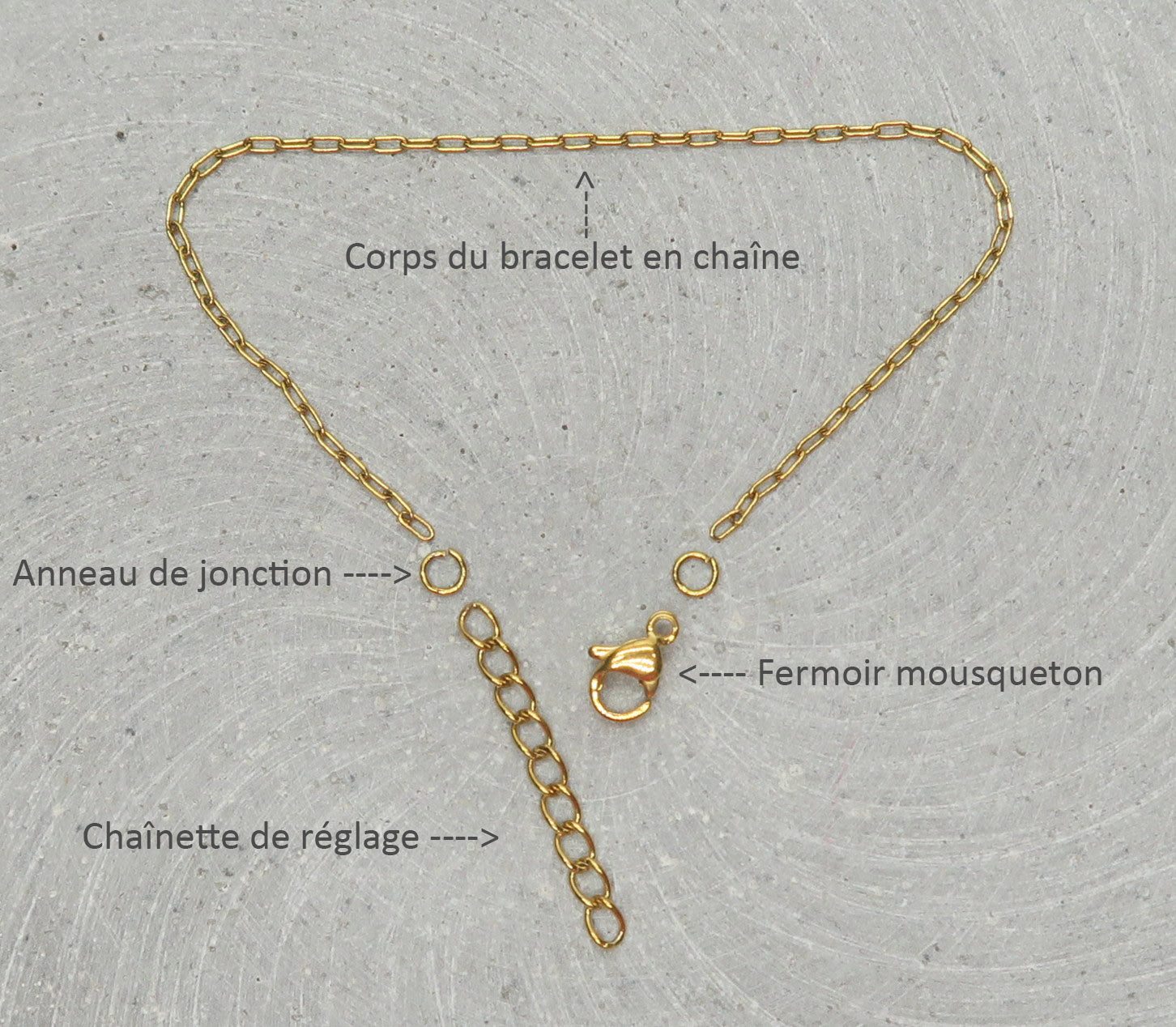 Pour le bracelet en chaîne ci-dessous, on a coupé la chaîne au milieu et on a accroché le connecteur avec des anneaux de jonction.