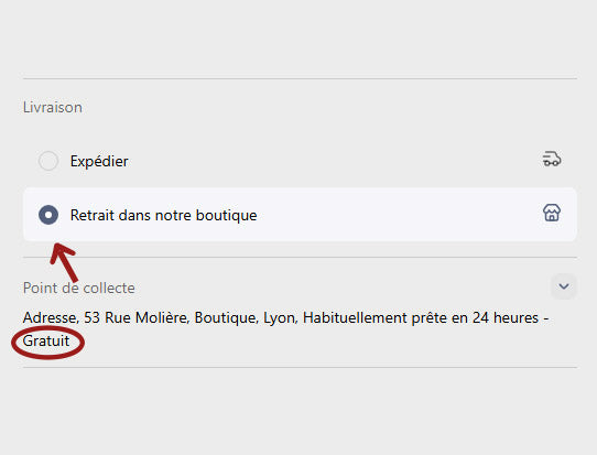 - Vous pouvez passer la récupérer directement à la boutique du lundi au samedi de 10h à 18h.