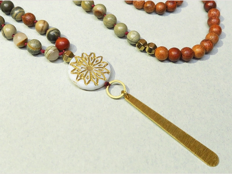 Les perles en jaspe feuilles d’argent sont pleines de nuances. Pour les faire ressortir, nous avons mis les plus claires pour une première section, les plus foncées pour une deuxième section et les plus texturées pour une dernière section. Nous avons terminé notre Mala avec des perles en bois. Chaque groupe est séparé par les perles repères en hématite dorée.