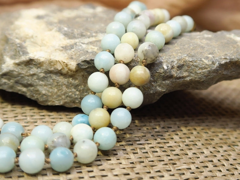 Pour créer votre propre Mala, vous aurez besoin de cordon synthétique (environ 1,80 mètres) assez fin pour pouvoir enfiler vos perles et, de 108 perles rondes. Vous pouvez choisir des perles en pierres naturelles 6mm avec les vertus que vous souhaitez pour vous soutenir au quotidien. Voici quelques conseils pour choisir vos pierres naturelles.
