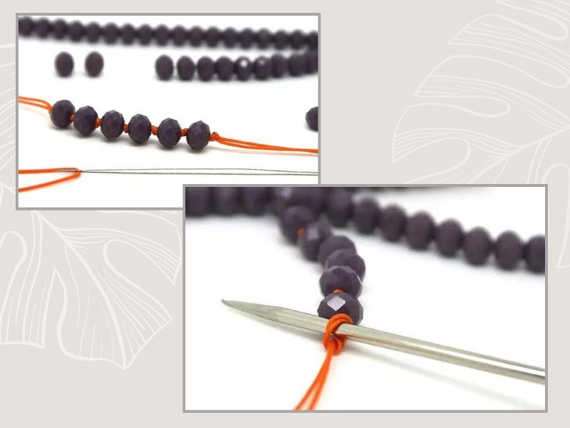 De notre point de vue, l’idéal est d’utiliser du cordon synthétique 0,5 mm et une aiguille pour simplifier la partie enfilage des perles.